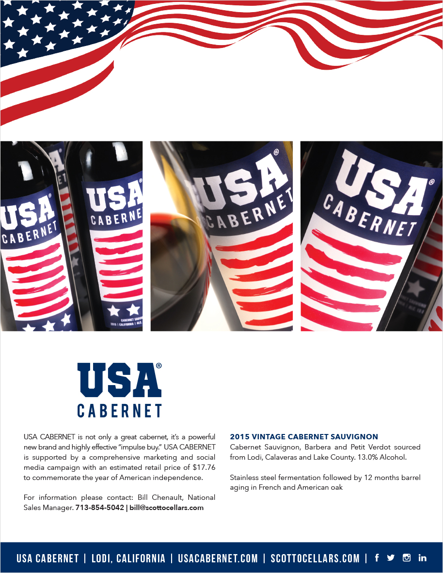 America has always loved rhyming brands: 7-Eleven, Famous Amos, Piggly Wiggly and Reese’s Pieces for example. We’re proud to present a new one. Introducing USA Cabernet. USA Cabernet doesn’t just rhyme, it forms a perfect complement. Like stars and stripes. This distinctive wine is a smooth, bold, easy drinking cabernet with aromas of blackberry and black current, followed by rich fruit flavors, and ends, of course, on notes of the Star Spangled Banner. USA Cabernet is America’s newest big wine brand, and one that celebrates the nation that nourished it. This is a wine for every American, (over the age of 21 of course) – from sea to shining sea.